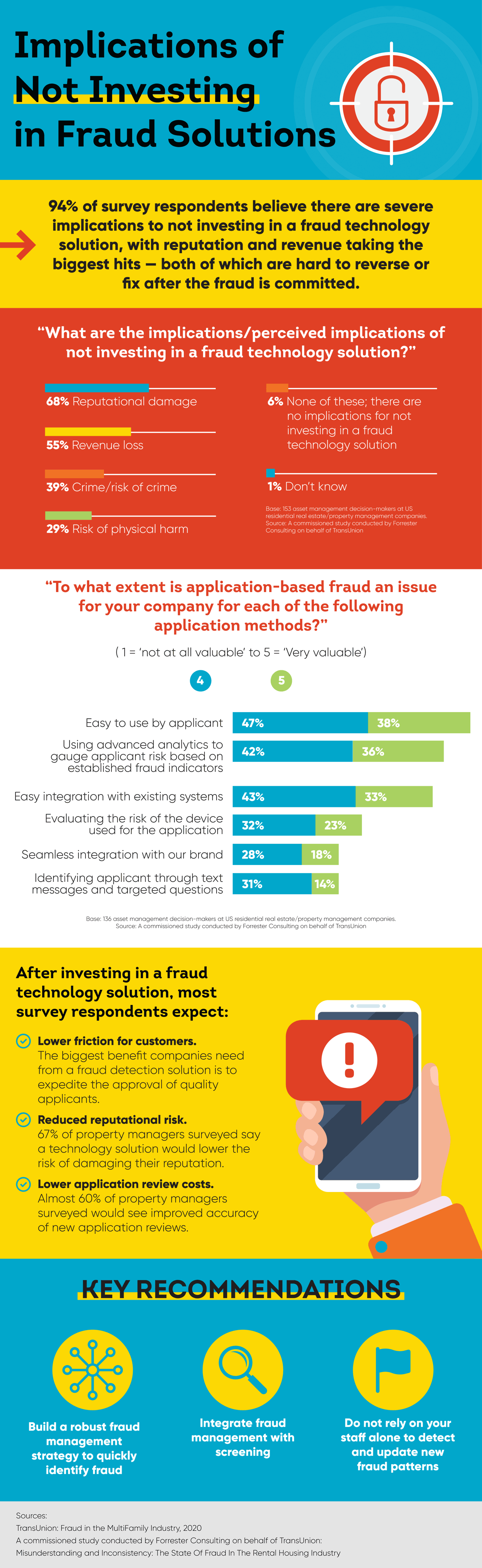 Landlords put a lot on the line when operating their rental business, such as their reputation and their finances, which is why it’s essential to enact protective measures. Forrester reported that 94% of survey respondents believe there are severe implications to not investing in fraud technology solutions. These respondents claimed reputational damage and revenue loss were the most significant implications of not investing in fraud solutions.